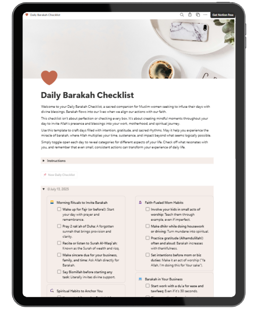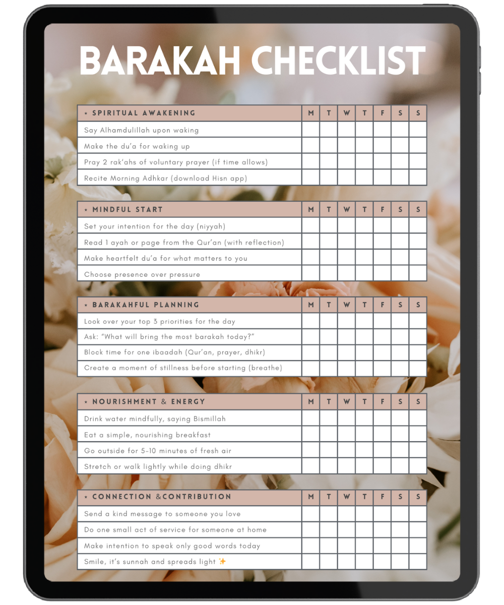 A sacred guide for Muslim women seeking to infuse each day with divine blessings. Barakah flows when we align our actions with faith. Print the PDF or use it on a note-taking app on your phone.